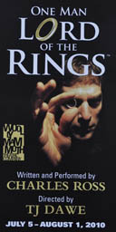 Another example of me catching the last day of a run, I managed to see the One Man Lord of the Rings, performed by Charles Ross at the Woolly Mammoth Theatre this afternoon. It was an impressive piece of acting, somewhat humorously capturing the three films of Lord of the Rings in a little over an hour. It was actually quite impressive through the use of voices, vocalizations of the soundtrack, and body movements how he was actually able to capture the spirit of the scenes, quickly morphing from one to the next. He also periodically managed to interact with the live audience as he went along, reacting to some things that were happening. The Woolly Mammoth is a nice small theater, and I think I’ll probably sign up for next year’s season subscription.