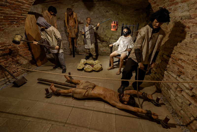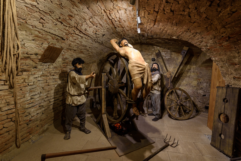 Corvin Castle is one of the largest castles in Europe. It is a Gothic-Renaissance castle and it is considered one of the Seven Wonders of Romania. One of the best sites from my last visit was Bran Castle, and although I didn’t manage to tour it this time, this was a great castle to visit. There are also some threads of connection of this castle to Vlad the Impaler, but that wasn’t really brought out at the castle. The origin of Bran Castle dates to the 13th and 14th century, and Corvin Castle began to be laid out in the 15th century. Apparently it has been destroyed by fire five times and subsequently rebuilt. Unlike Bran Castle it is uninhabited, but it is an impressive and imposing structure. We walked all over it, and I took lots of pictures. It looms over the surrounding town. It was a very interesting castle to visit. In some of the lower areas they had some historical/archeological displays. After we left the castle proper, right adjacent to it was a museum of torture which had some fairly explicit displays setup. Bran also had a torture tour, but it mostly focused on the medieval torture devices, whereas this one showed how they were used on people.