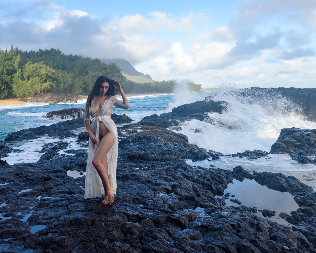 Our final shooting day was another long one, up before sunrise and out till after sunset. We started the day on the north side of Kauaʻi on Lumahaʻi Beach. This is where they filmed the “nurses beach” for the movie South Pacific. There was an interesting cliff structure, and some lava rock thrusting out into the bay. It was a short walk down from where we parked to the beach. We got some nice shots of the models on the cliffs and some shots of waves breaking over the rocks as the sun rose. Finally we got a good dump of rain before we called it quits, a frequent theme of this trip.