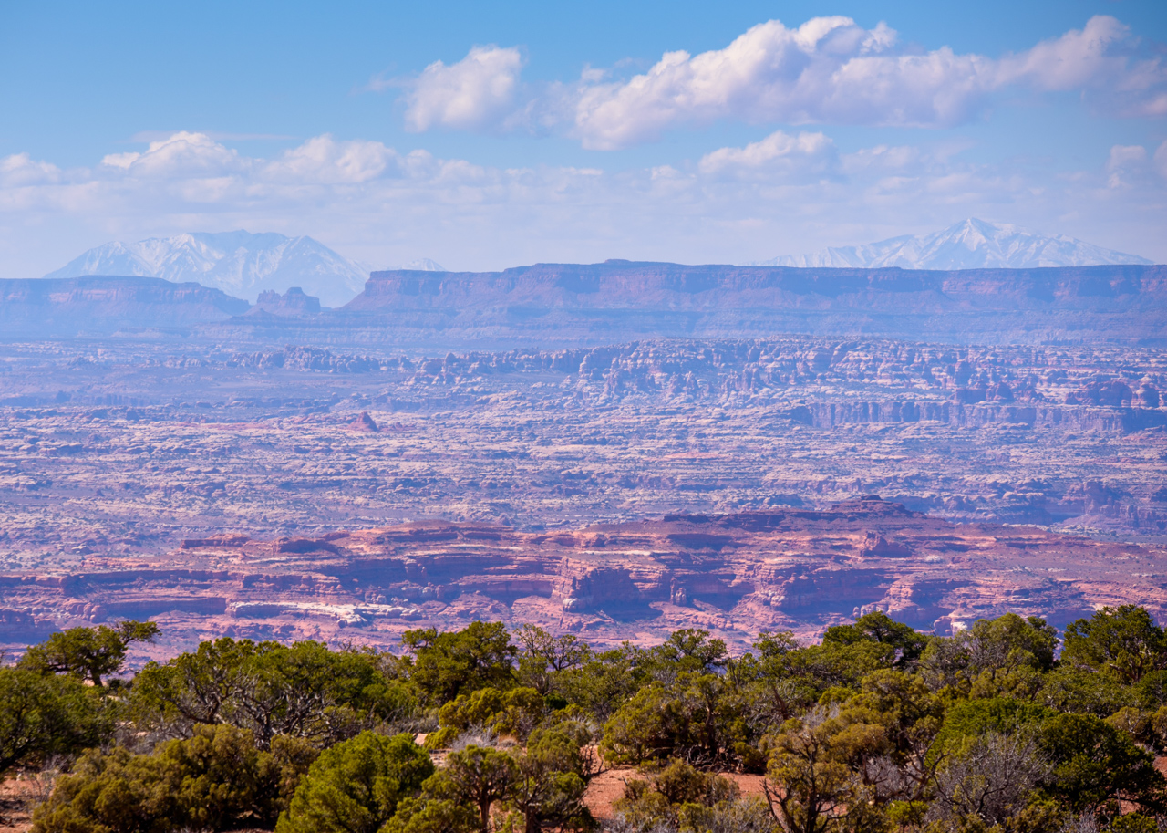 The next day we headed down towards the Moab area for what turned out to be a wide-ranging scenic tour. We took the road traveling along the Colorado River and were hoping to see some bald eagles. It was a bit windy and we never did see any, but we saw the spectacular landscapes. Coming in we had a nice view of Fisher Towers and the monoliths from Professor Valley where I’ve shot before. We explored up one of the side roads that took us above and behind them for a different view. Passing Moab we sent south on Highway 191, driving by Wilson’s Arch, an interesting sandstone arch right off the highway, and then headed out west into the desert. We ended up at Needles Overlook, which sits at the edge of a large plateau overlooking a vast valley that contains Canyonlands National Park. The overlook was part of a nicely maintained little park that had an interesting path going around the curve of one outcropping of the plateau. The panorama was amazing. After spending some time there for photography, we headed back into Moab for a late lunch.