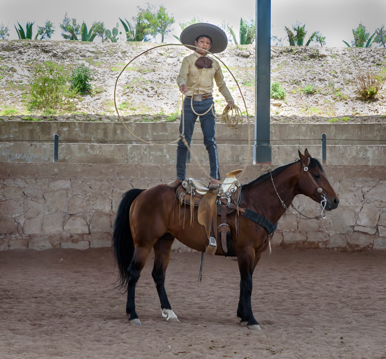 Again, near sunset, one of the charros brought out a couple of horses to a cactus field outside the hacienda gates, and provided an impressive demonstration of horse handling skills. He performed passage gait with the horse, having him basically prance in place. He made the horse kneel and bow down, and even go to laying down. He sat on him while he was down and then the horse got up with the rider on him. Really very impressive.
