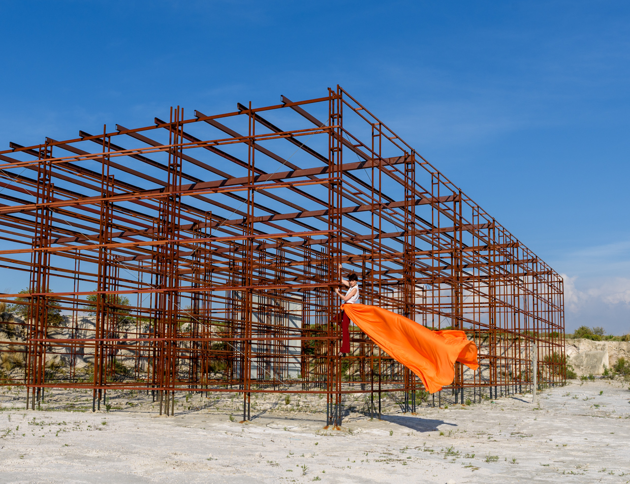 Again after lunch and after a charro demonstration, we again shot around the hacienda. We then went over by the quarry that provided the stone for the hacienda, and on the frame structure of a building under construction, we shot the models in very long fashion dresses.