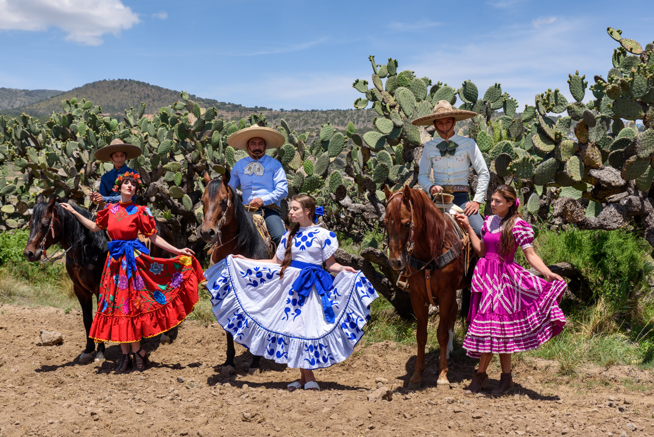 After the hacienda visit, on the way back, we fulfilled one of Mimi’s photographic dreams in front of a cactus forest beside the road. She had some charros come out from her hacienda with horses, and the models dressed in traditional Mexican dresses, and we got shots of some very classic Mexican scenes.