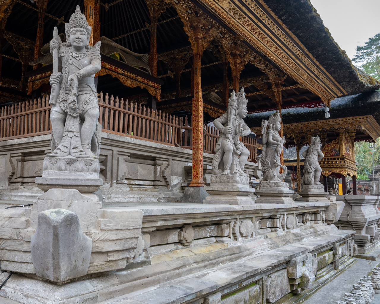 Afterwards, we continued northwest and stopped in Kintamani, which is on the edge of the caldera of a volcano, and went to an overlook inside a restaurant where we had a beautiful view of the valley and the lake that was in the caldera, Lake Batur (Danau Batur). After that brief stop, we headed back south to a Hindu Balinese water temple, Tirta Empul. There were lots of beautifully carved statues and architecture. We were required to wear sarongs out of respect to the location. We spent some time there touring around and taking pictures. The only negative was that you were guided out of an exit that sent you into a maze of tourist souvenir stands. It reminded me a bit of the vampire stuff at Bran Castle, but they were much more aggressive. I made the mistake of stopping once, and ended up getting pressured to get a bunch of stuff. But it helps the local economy, so I can’t complain too much.